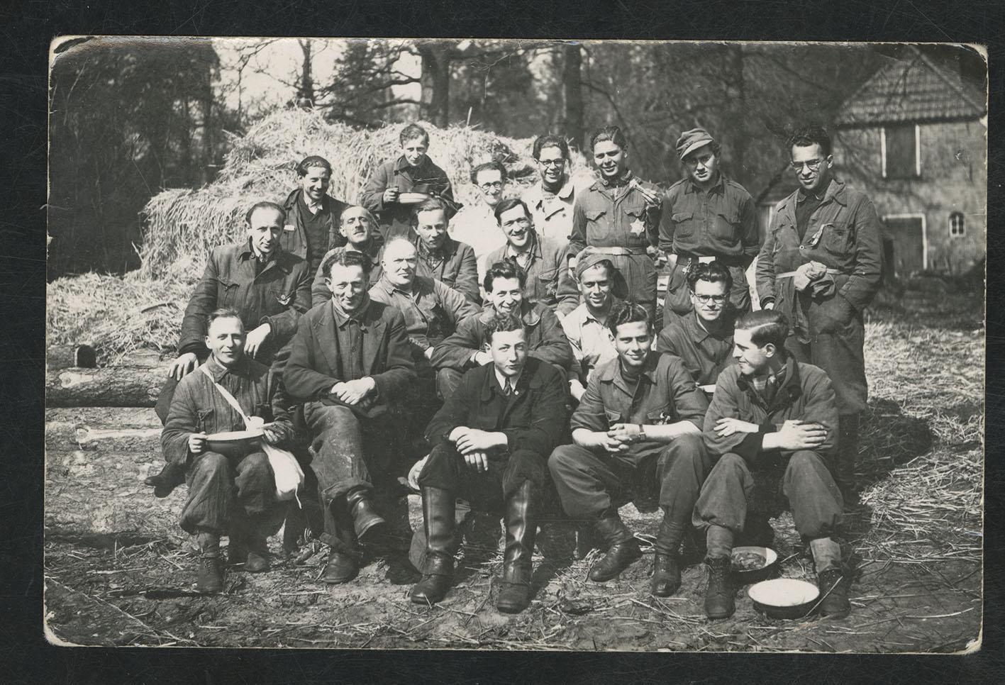 Groepsfoto gemaakt in de omgeving van kamp Westerbork met joodse dwangarbeiders waaronder Jacob Hamburg en zijn broer Salomon Hamburg, ca. 1943