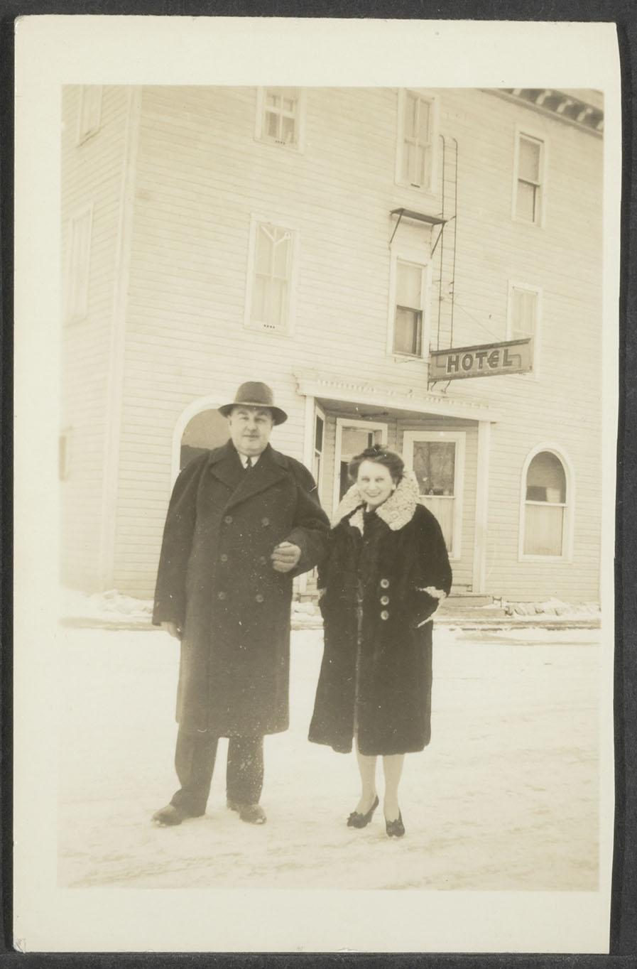 1. Tony en Ester van Oostdam staand voor een hotel 2. paard trekt karretje waarop kinderen zitten en soldaten (?)