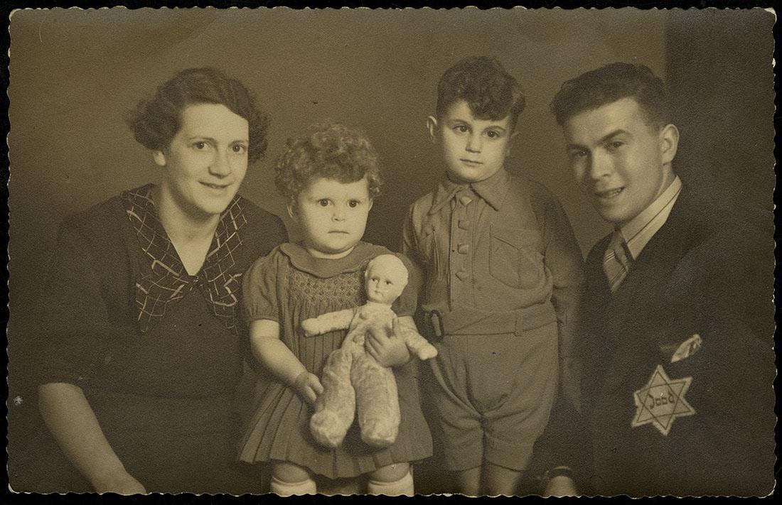 Meijer Papegaaij met jodenster, zijn vrouw Esther Papegaaij-de Hond en hun twee kinderen Herman en Lena, 1942