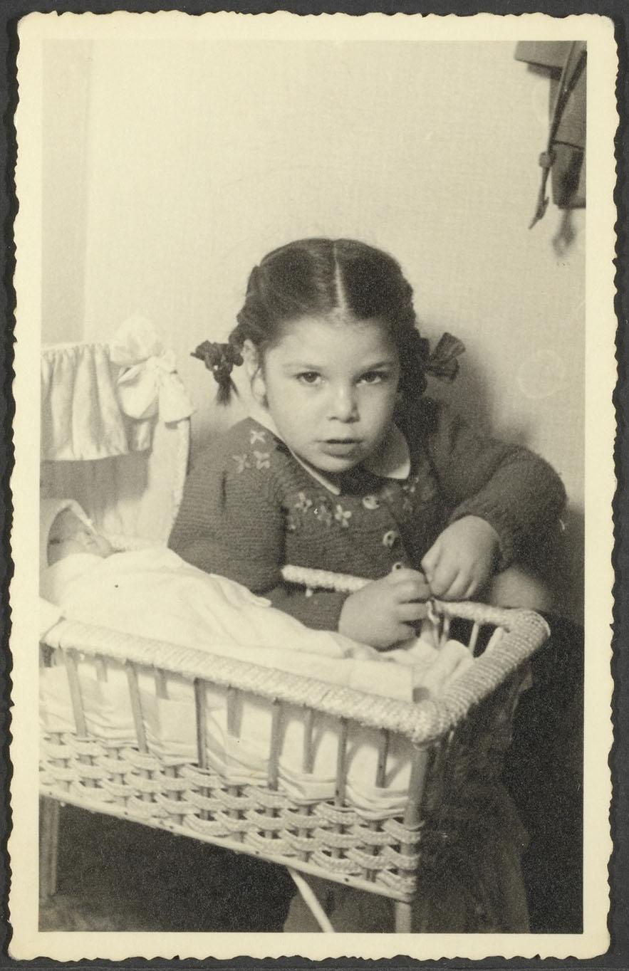 Foto van Vogelina (Lineke) Roodveldt achter een poppenwiegje, ca. 1942