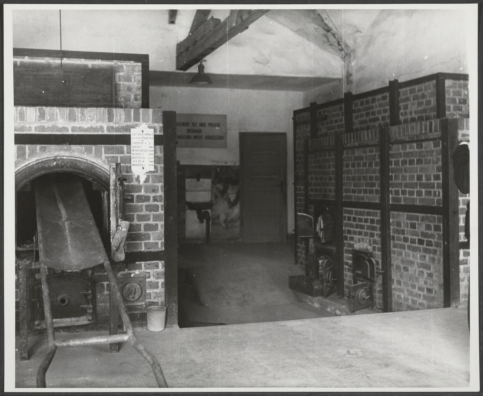 Interieur van het oude crematorium in het voormalige concentratiekamp Dachau, 1947