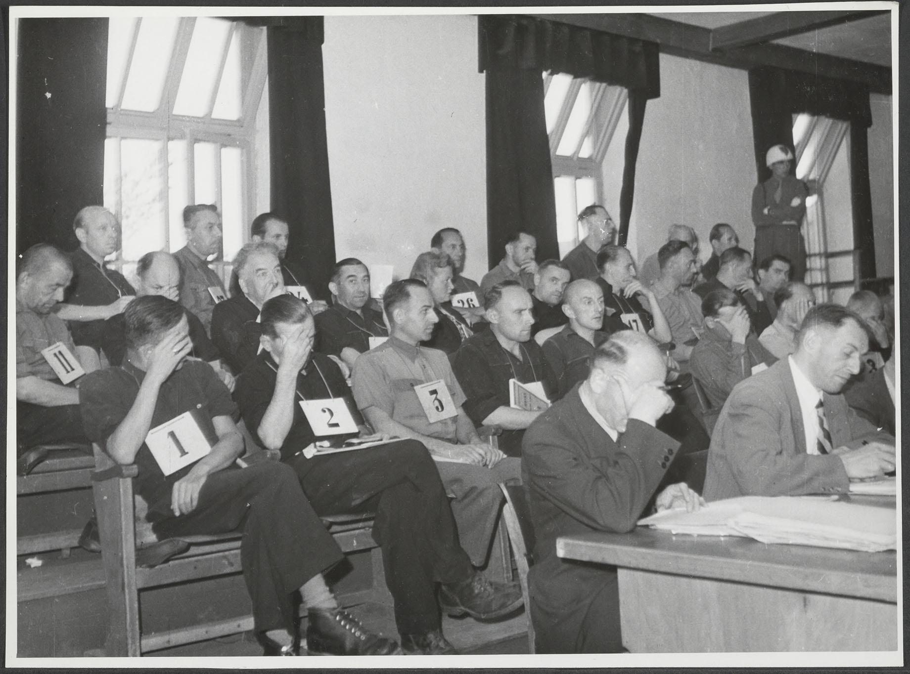 Oorlogsmisdadigers tijdens de Dachauprocessen in het voormalige concentratiekamp Dachau, 1947 - Oorlogsbronnen.nl