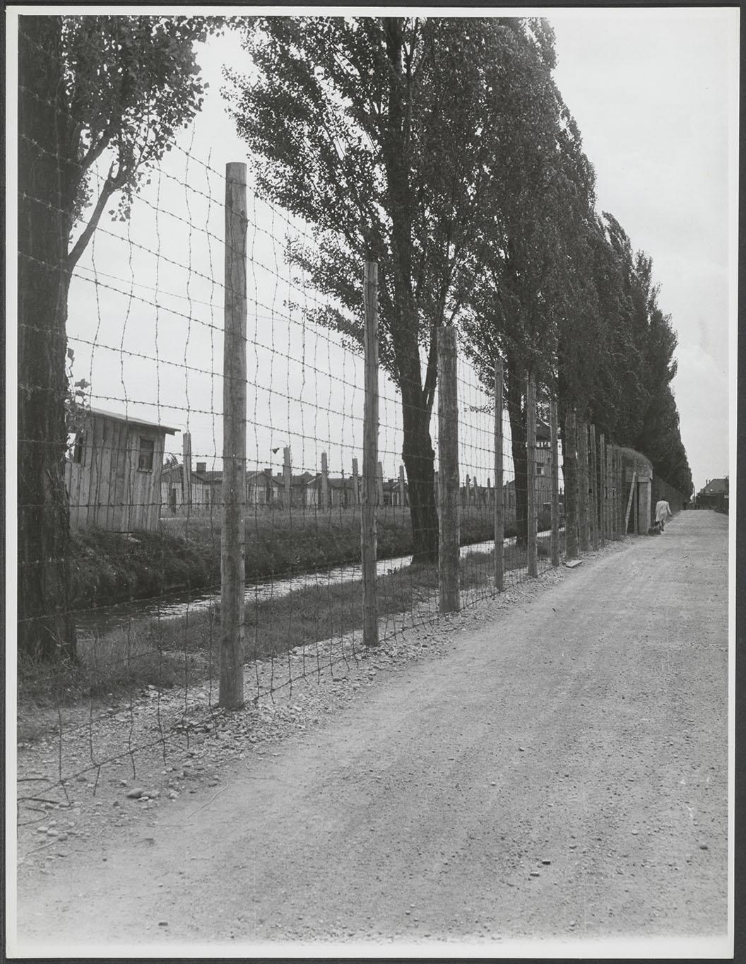 Weg met populieren en een hek met daarachter barakken in het voormalige concentratiekamp Dachau, 1947