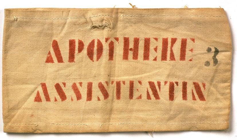 Mouwband van een apothekersassistent in kamp Westerbork. De apotheek was met de polikliniek en het laboratorium gehuisvest in barak 4. Sonja van Herschel-van Gelder (geb. 11 mei 1922) werd een maand na haar komst in Westerbork, in december 1942, apothekersassistent. Zij behield de band in Bergen-Belsen. Dankzij de Amerikaanse nationaliteit van haar vader, die ook gevangene was, kon de familie deel uitmaken van een bevoorrechte groep, geďnterneerd in november 1944 in het Internierungslager Wurzach en bevrijd door de Fransen in 1945. Zo bleef de band bewaard.