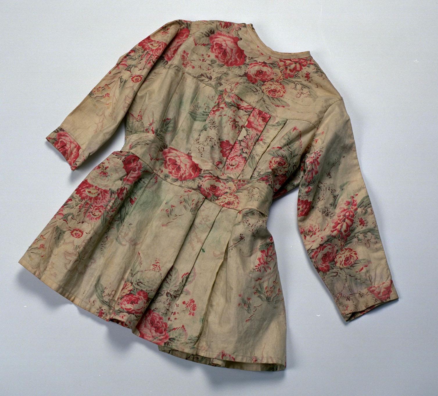 Jurkje van lichte stof bedrukt met rode bloemen en groene bladeren. Op de rug een ceintuur.