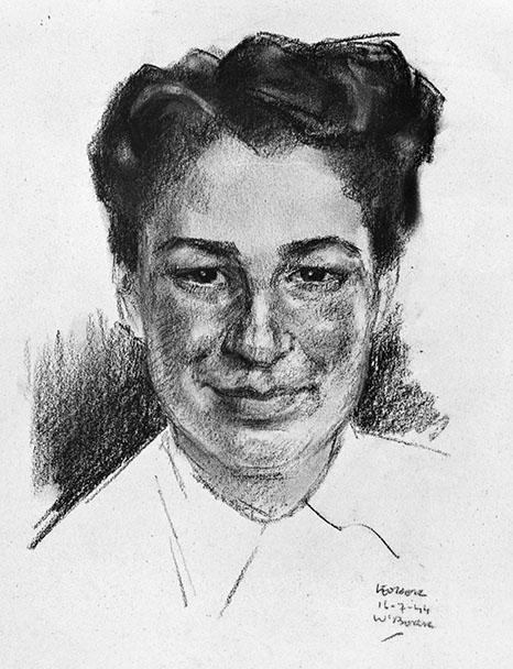 Jonge vrouw, hoofd en face, lachend. De vrouw heeft kort, donker haar. Het hoofd is gedetailleerd getekend, het kraagje met enkele lijnen aangegeven.