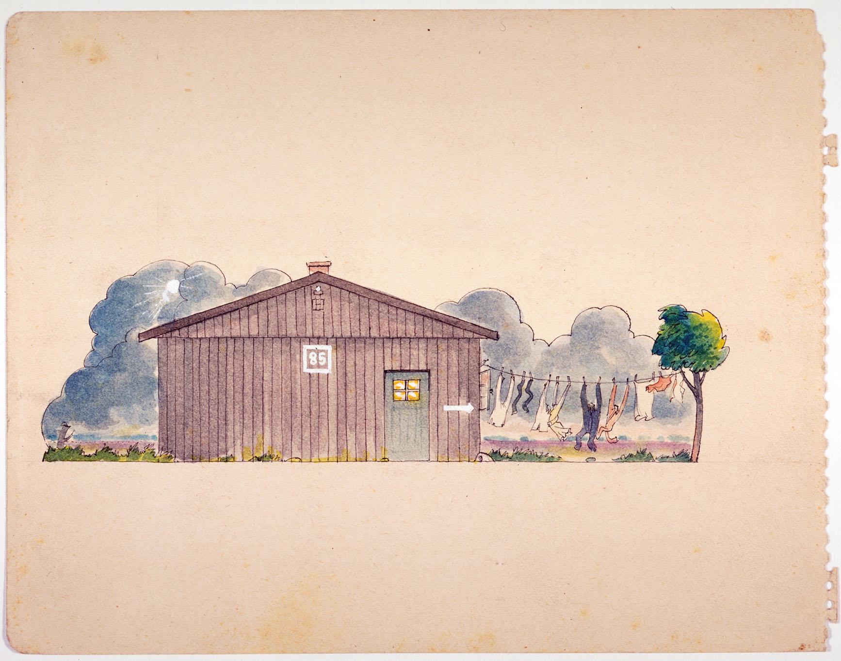 Barak met een deur en een nummer: 85. Van de barak naar een boom hangt een lijn vol wasgoed. Op de achtergrond een horizon met een zware wolkenlucht.