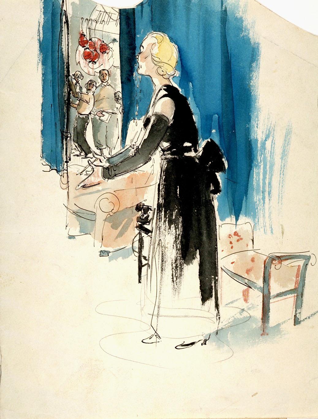 De actrice Camilla Spira ten voeten uit staande naar links, huilend met de armen voor zich in een smekend gebaar, op het toneel. Links staan vier mannen tussen de coulissen te kijken.
