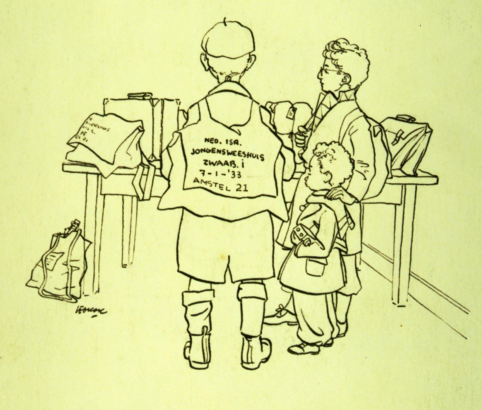 Drie kinderen ten voeten uit staande, twee en profil naar links, een op de rug gezien. Ze staan voor een tafel met koffers en tassen. Op de rug van een van de kinderen staat 'NED. ISR/ JONGENSWEESHUIS/ZWAAB, I./7-1-33/AMSTEL 21'