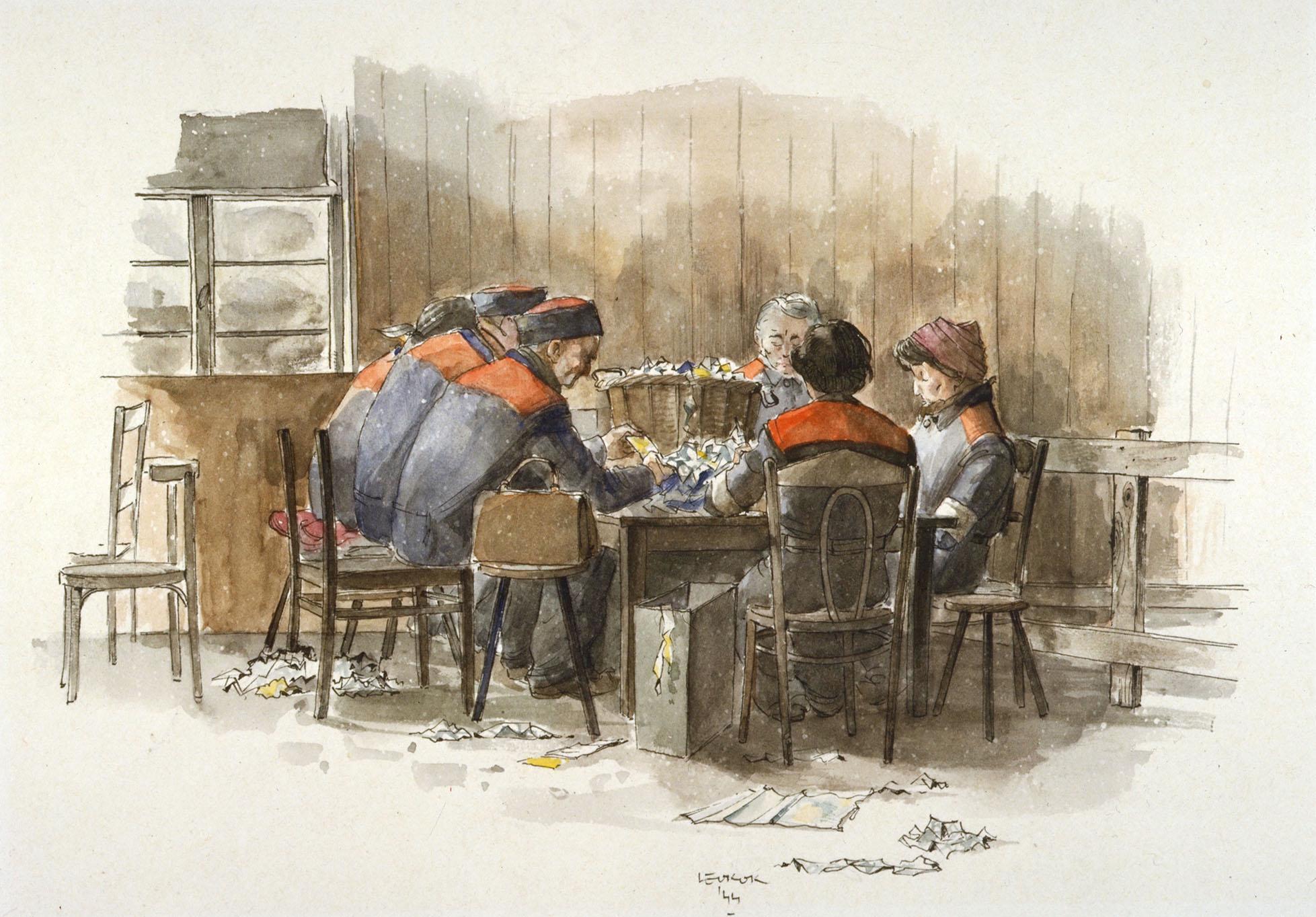Zes strafgevangenen, zittend rond een tafel waarop een mand met zilverpapier staat, bezig met het splitsen van zilverpapier.