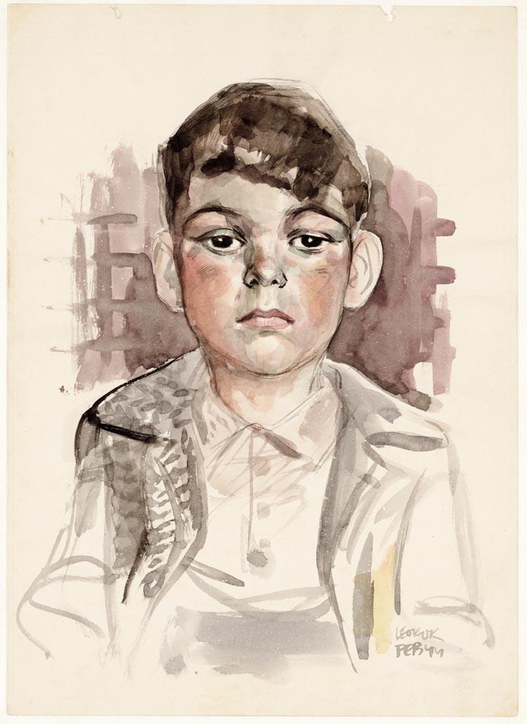 Mischa Breslauer, borststuk en face. Hij heeft een jasje aan wat met enkele lijnen is aangegeven, rode wangen en grote oren.