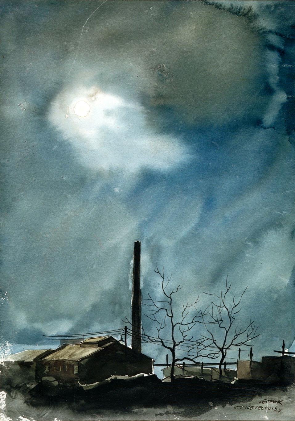Het ketelhuis van Westerbork, half in contouren aangegeven tegen een zwartblauwe nachtelijke hemel met volle maan.