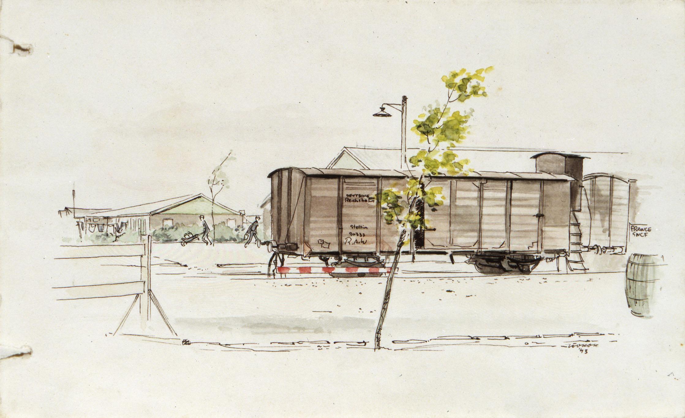 De laatste wagon van een trein met opschrift 'DEUTSCHE/REICHS- BAHN/STETTIN/90333/R.A.W.'. Op de voorgrond een heldergroen boompje, op de achtergrond een barak en een man met kruiwagen.