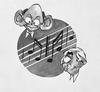 Maurits van Kleef achter een drumstel, ten voeten uit zittend en trois quart naar links, hoofd en profil naar links. Hij draagt de jodenster, op de bassdrum staat 'jazz'.