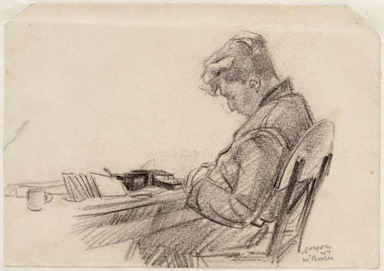 Arie Bon, kniestuk zittend en profil naar links aan een tafel, slapend.