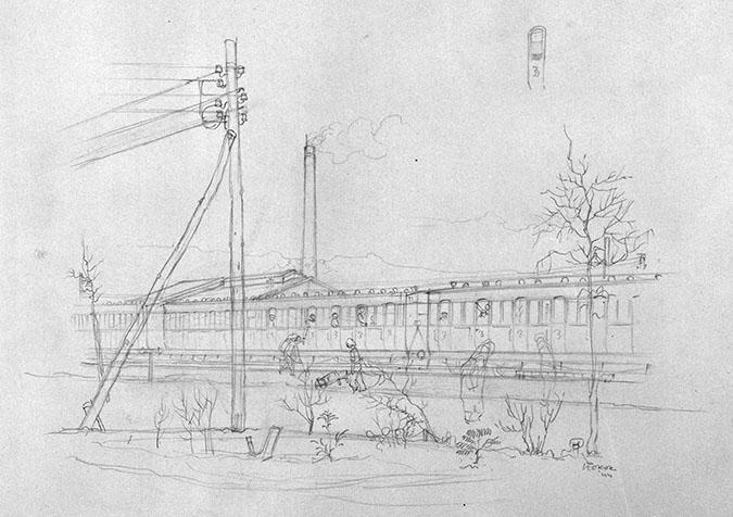 Trein met personenwagons met mensen er in en er voor. Links op de voorgrond een telefoonpaal. Links achter de trein is het dak en de schoorsteen van het ketelhuis te zien.