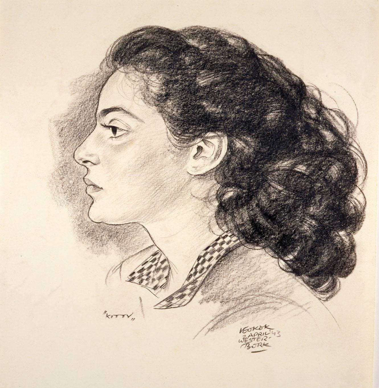 Jonge vrouw, hoofd en profil naar links, met donker krullend haar tot op de rug en geblokt kraagje.