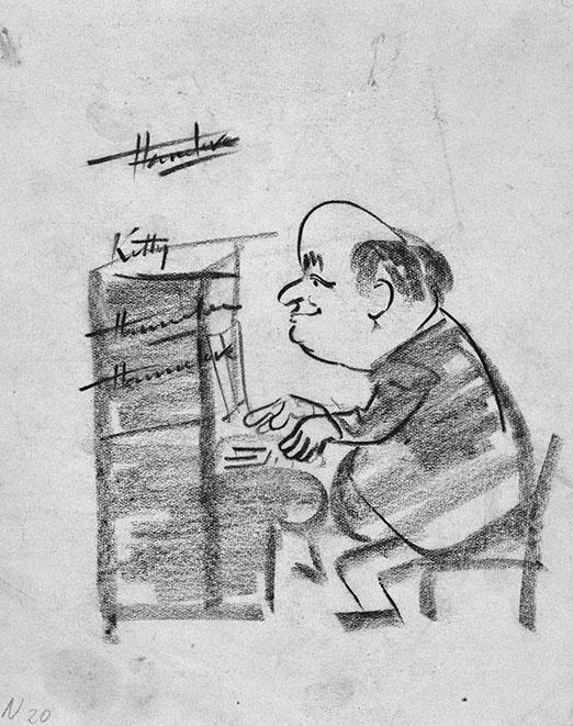 Karikaturale voorstelling van Hans Krieg, ten voeten uit zittend en profil naar links, achter de piano. Verso: Voorgevel met twee huisdeuren met de nummers 53 en 51.
