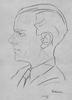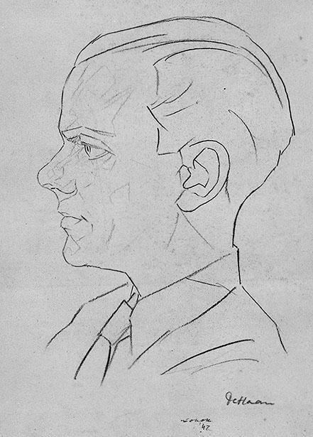 De heer de Haan, schouderstuk en profil naar links. Schetsmatig getekend. verso: groepje mensen dat wordt gedrild door een man met een zweep, op de rug gezien. Er staan een vrouw (verpleegster?) en een jongen bij te kijken, ook op de rug gezien. Het geheel in een kadertje.