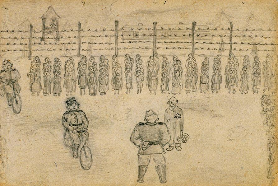 Rijen gevangenen op een appèlplaats. Op de achtergrond een wachttoren, bomen en een hek van prikkeldraad.