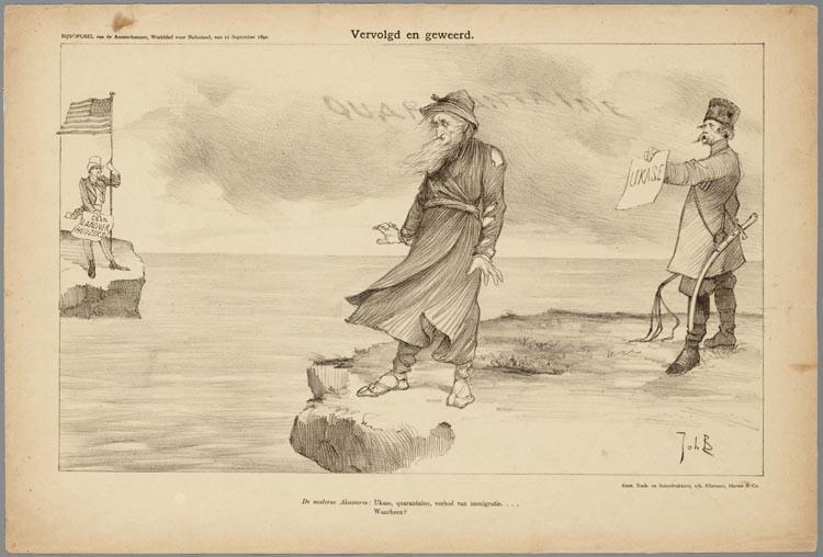Russische jood wordt door een militair uitgewezen. Aan de overkant van de oceaan staat Uncle Sam, leunend op een vlaggenstok met in zijn hand een bord met de tekst: "geen landverhuizers".