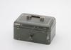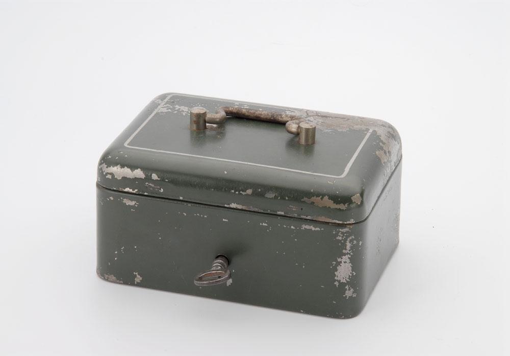 Groen metalen geldkist met handvat en slot. Inclusief vier enveloppen met papiergeld.