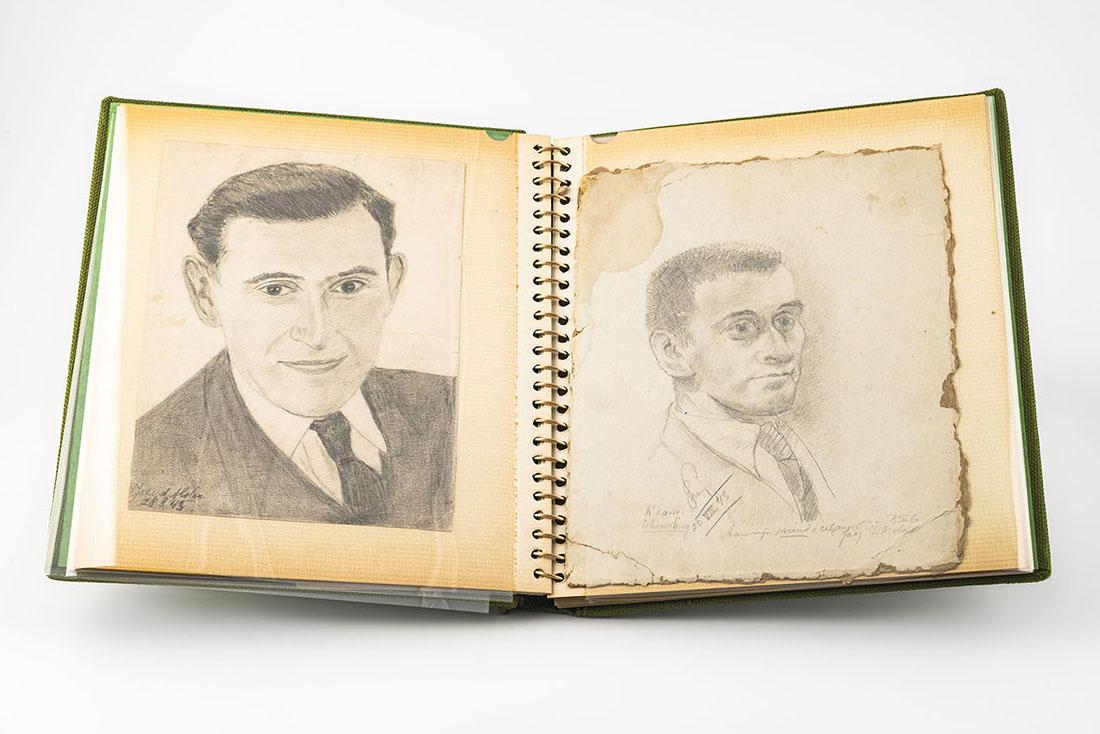 Schetsboek bestaande uit een fotoalbum met daarin 11 losse schetstekeningen van Isaak van der Molen (1909-1945) en een fotokopie. De tekeningen zijn schetsen van dagelijkse gebruiken binnen het concentratiekamp en portretten van dierbaren.