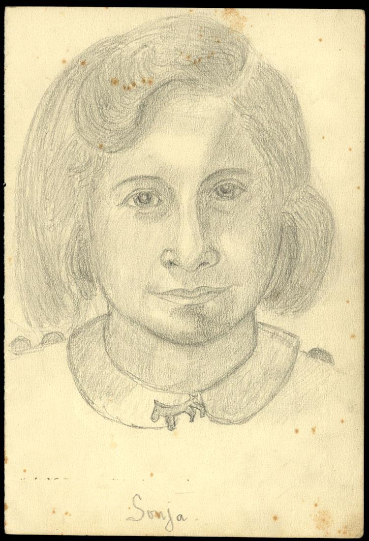 Portret van meisje met halflang haar en scheiding opzij. De sluiting van haar blouse is een hondje. Op de schouders zitten bolle knoopjes.