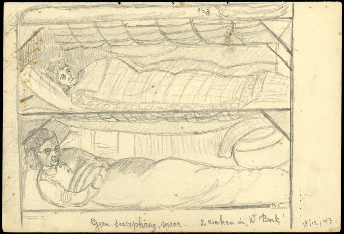 Twee zieke vrouwen, boven elkaar in stapelbed. Op de bedden de nummers 163 en 165.
