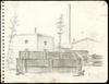 Schoorsteen ketelhuis met omliggende gebouwen met zadeldak (r) en plat dak (l)