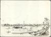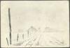 Een landweg door een vlak en kaal landschap, op de voorgrond een halfdood boompje, in de verte de contouren van kamp Westerbork.