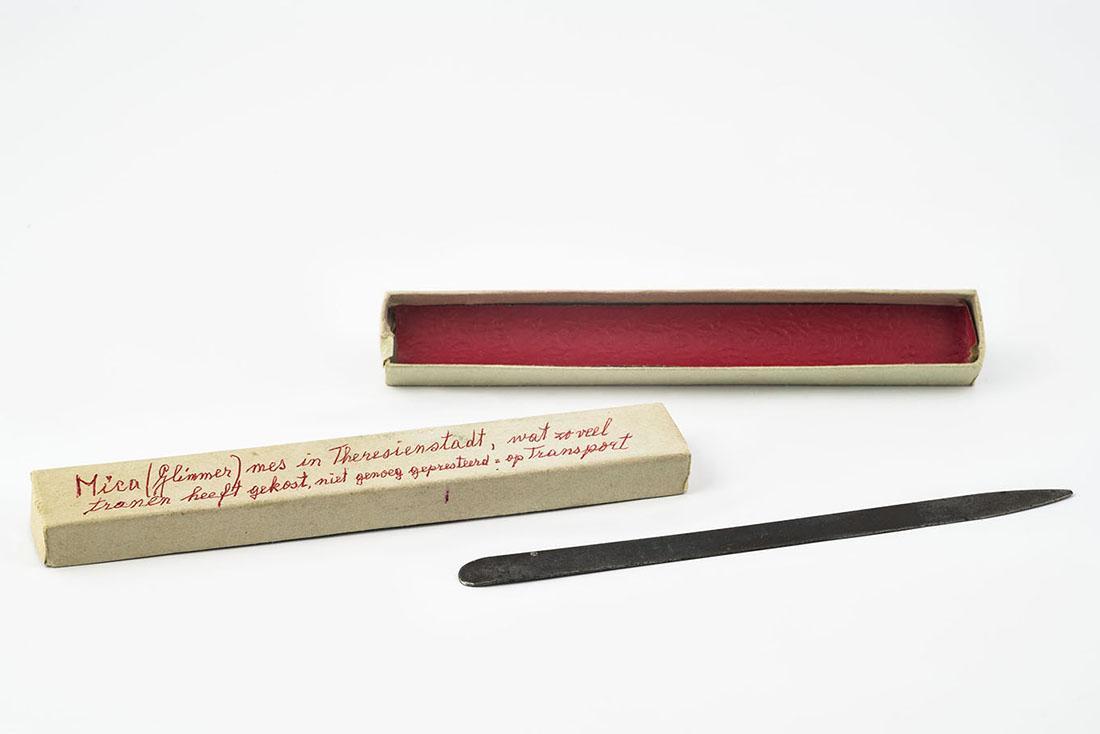Tentoonstellingstekst Nationaal Holocaustmuseum, maart 2024 Dwangarbeid Veel vrouwen werden tewerkgesteld in de Glimmer Werkstätte. Hier werd glimmer, of mica, gespleten: een helder mineraal dat gebruikt werd in de oorlogsindustrie. De vrouwen moesten de mica snijden op een plankje, zoals dit exemplaar van Sientje Leijdesdorff-Frank. Gisela GruberSchnek schreef op het doosje van haar glimmermes: ‘Mica (Glimmer) mes in Theresienstadt, wat zoveel tranen heeft gekost, niet genoeg gepresteerd = op Transport.’