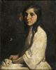 Meisje met lang haar waarin een rode strik, gekleed in witte jurk, zittend met witte bloemen op haar schoot, kniestuk en profil naar links en gezicht a trois quart naar links.