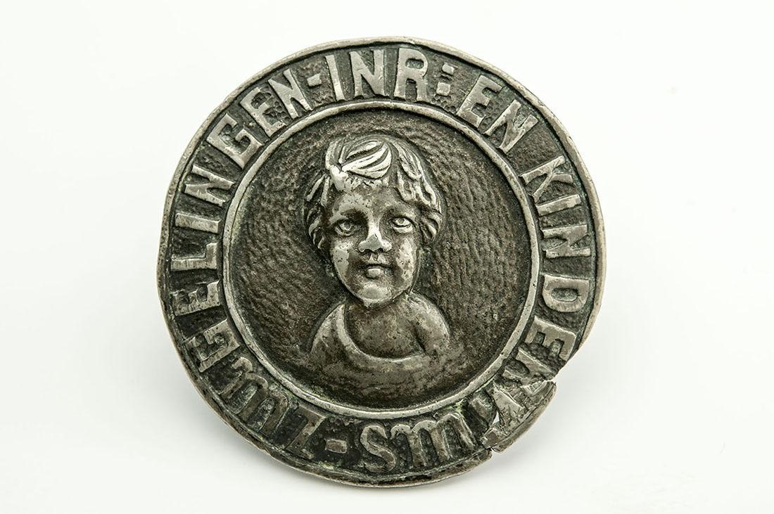 Rond insigne met speld, met tekst rond een reliëfvoorstelling van een kinderhoofdje.