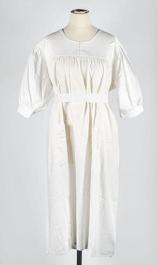 Ziekenhuisschort gedragen door Ellen van Oven tijdens haar vlucht uit de trein naar Westerbork. Ellen van Oven (1920-2012) werkte als analiste in het Ned. Israelietisch Ziekenhuis aan de Nieuwe Keizersgracht in Amsterdam, dat in augustus 1943 door de Duitsers leeggehaald werd. De patiënten werden naar Westerbork gedeporteerd. Na tot op het laatst toe voor patiënten te hebben gezorgd, wist ze eerst aan de Duitsers te ontkomen. Ze werd echter ontdekt op haar schuilplek in een leegstaand huis in de Amsterdamse jodenbuurt en op de trein naar Westerbork gezet. Een lotgenoot in de trein spoorde haar aan te vluchten: "Je hebt een uniform aan, je kan zo doorgaan voor iemand van het Rode Kruis. Klim daar achterin die Rode Kruisauto met brood". Ellen volgde zijn raad op, ontkwam en overleefde de oorlog op een onderduikadres bij Roelof en Coba van Daalen. Het schort heeft ze haar hele leven bewaard.