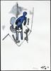 Een in een naïeve gestileerde stijl geschilderde aquarel voorstellende een man voor een uit zes personen bestaand publiek. Is hij aan het fotograferen?