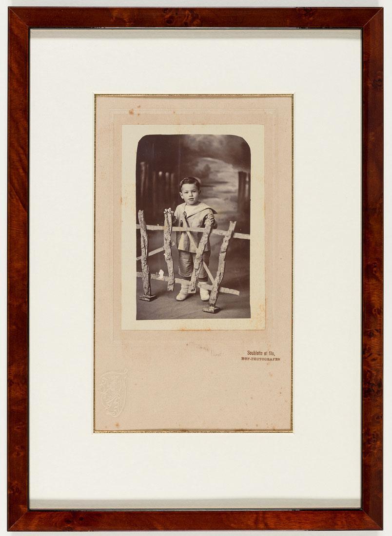 Portretfoto van George L. Maduro op circa vierjarige leeftijd. Hij draagt een matrozenpakje. De foto is ingelijst.