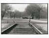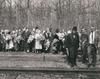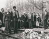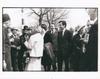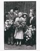 Prinses Juliana temidden van andere mensen. Ze draagt - evenals de beide heren naast haar - een bloemstuk.
