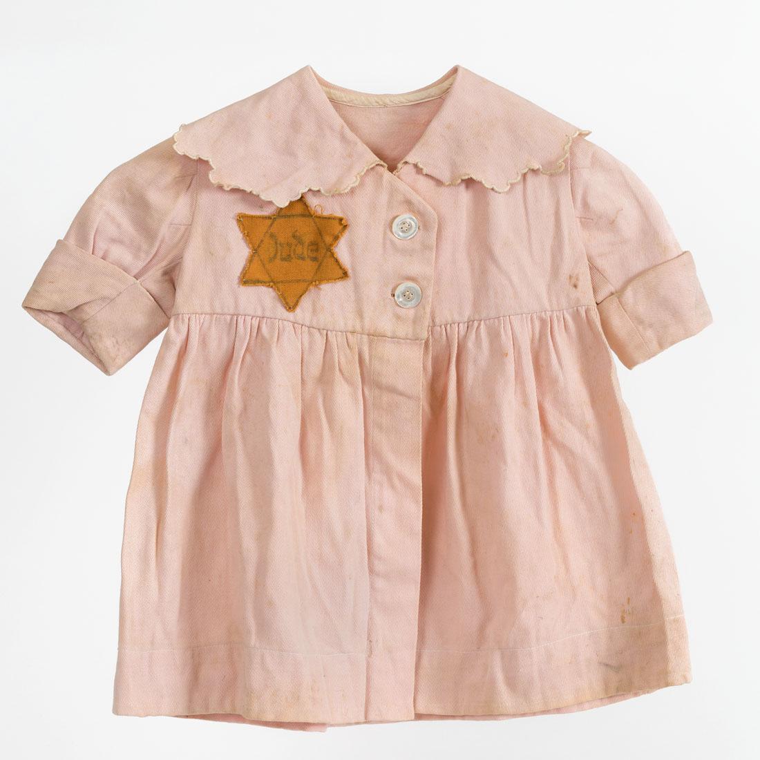 Tentoonstellingstekst Nationaal Holocaustmuseum, maart 2024 Kleding met ster Op 29 april 1942 kondigden de nazi's de invoering van de Jodenster aan. Deze maatregel stelde Joden vanaf zes jaar verplicht een gele ster op hun bovenkleding te dragen, links op de borst. Een maand nadat in 1941 de Jodenster in Duitsland verplicht werd, vond daar de eerste deportatie plaats. Toen de Jodenster ook in Nederland werd ingevoerd, veroorzaakte dat dus een golf van angst. Het is onbekend van wie het jurkje met de Duitstalige ster was. Vermoedelijk was het een poppenjurkje, want het is erg klein en de ster zit rechts. Het langere jurkje was van Betty Appelboom uit Amsterdam. Ze werd op dertienjarige leeftijd in Sobibor vermoord, samen met haar ouders en broer.