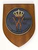 Houten schildje, waarop een kunststof cirkel met goudkleurige rand is bevestigd. Met daarop in reliëf een kroon, een oranje W en een goudkleurige tekst.