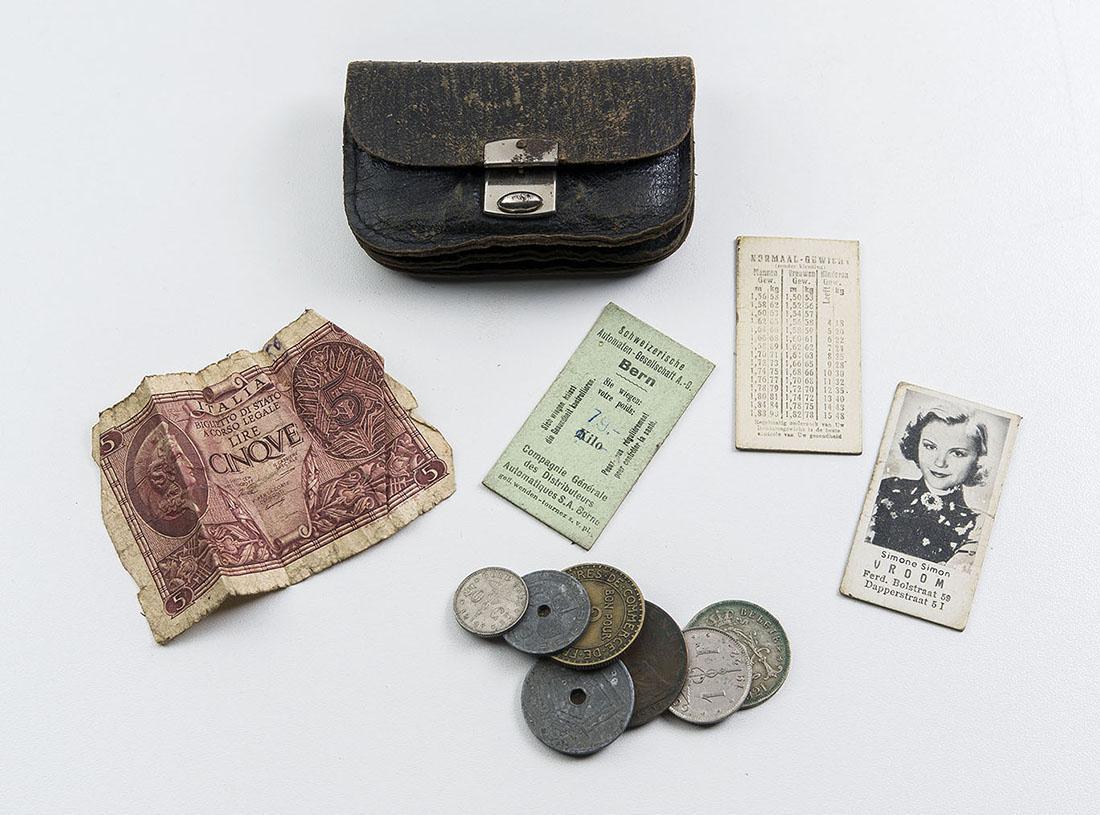 Kleine leren portemonnee met drie vakken en een metalen sluiting. In de portemonnee bevinden zich 23 munten uit diverse Europese landen, een biljet van vijf lire, drie kaartjes uit een personenweegschaal met muntinworp (waarvan een met een foto van een filmster) en een gescheurd (kranten)portretje van Theodor Herzl.