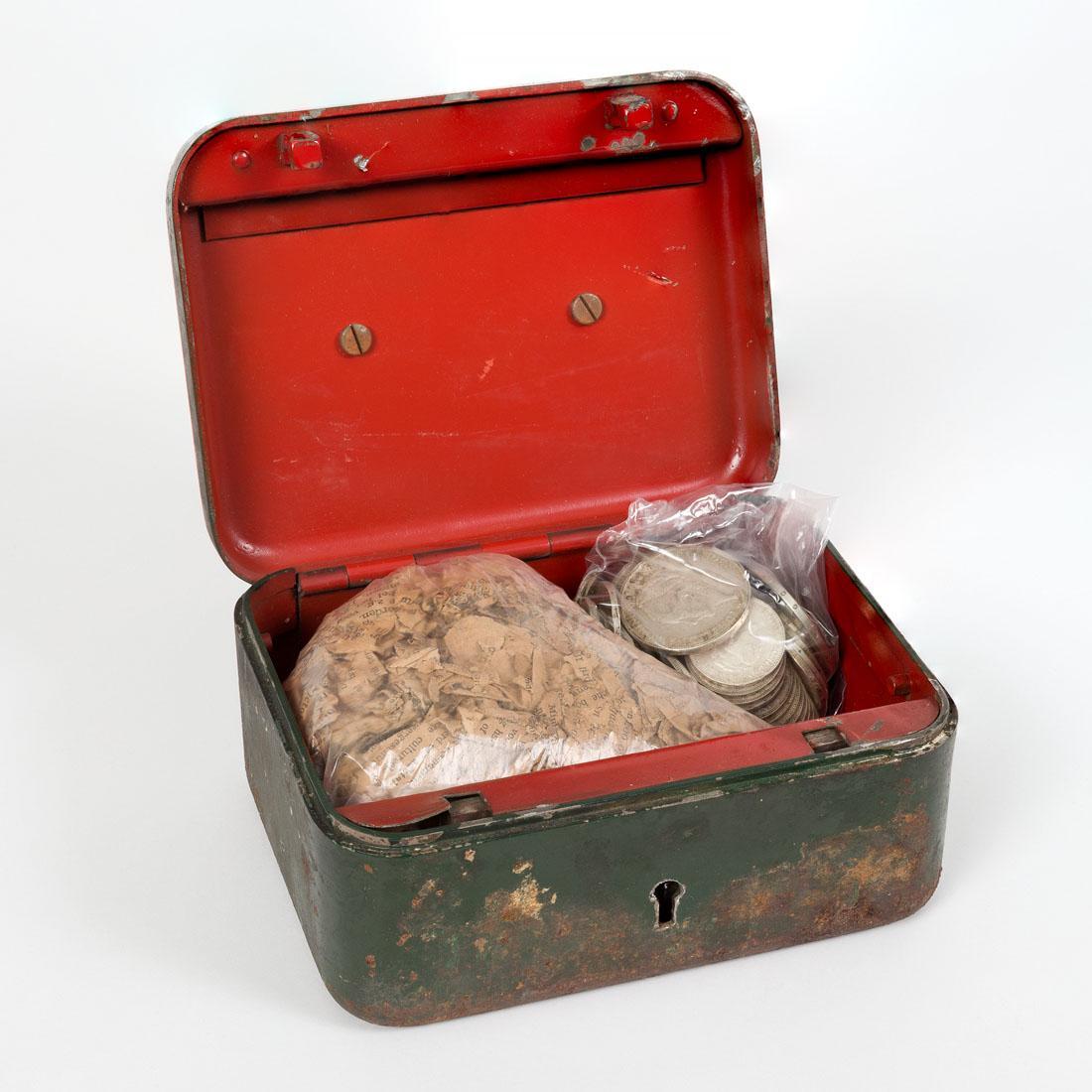 Groen ijzeren geldkistje, van binnen rood. voorzien van baardslot en verchroomd hengsel aan het deksel. In het kistje zitten zilveren munten: 40 zilveren guldens, 3 zilveren rijksdaalders, 27 zilveren dubbeltjes en 13 zilveren kwartjes.