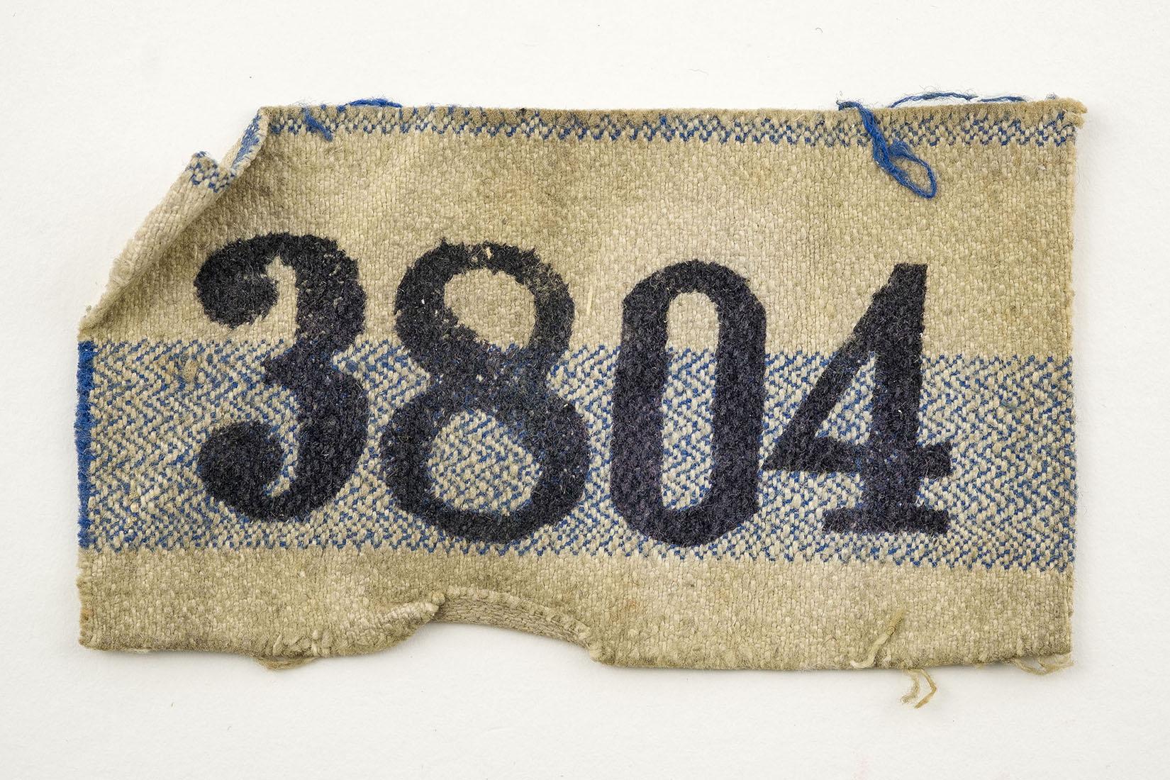 Kampnummer van concentratiekamp Buchenwald. Het label is gemaakt van de witblauw gestreepte stof waar ook de kampkleding van gemaakt werd.