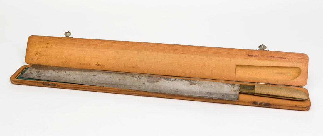 Groot rechthoekig stalen slachtmes met houten heft.