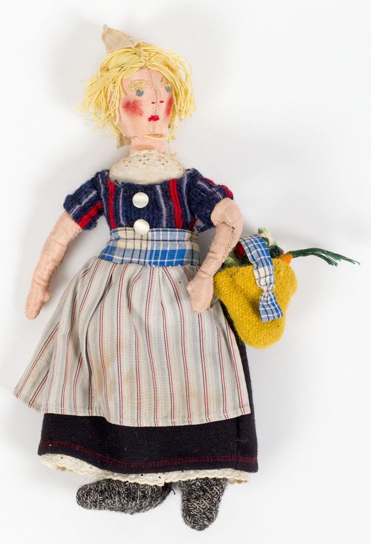 Poppetje van textiel, voorstellende een vrouw met blond haar en een kapje op haar hoofd. Ze draagt een mandje met groente.