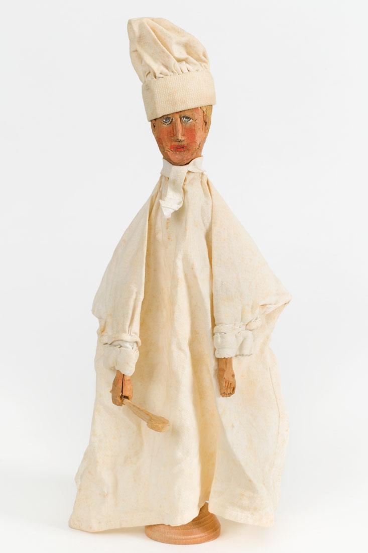 Poppenkastpop voorstellende een kok met een pollepel in zijn hand.