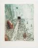 Drieluik van semi abstracte kleurenetsen waarop Auschwitz staat afgebeeld.