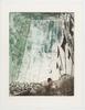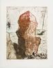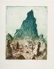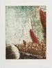 Semi abstracte kleurenets met als voorstelling een groot rotsblok en een spoorlijn.