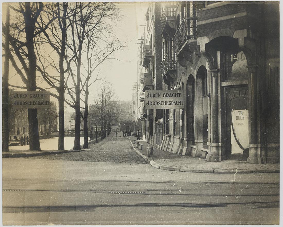 Gezicht op hoek Nieuwe Achtergracht-Weesperstraat tijdens Tweede Wereldoorlog.