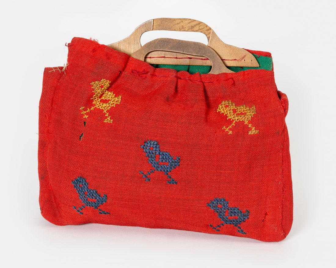 Tasje gemaakt door Emmy Worms. Vervaardigd van rode stof waarop blauwe en gele vogeltjes zijn geborduurd. Het tasje is gevoerd met groene stof en voorzien van twee triplex handvatten.